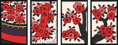 三月——彌生(Yayoi) 櫻與幕: 是櫻花絕景的時節,故三月份的紋樣全部被櫻花佔據。櫻花的“光”牌下畫著稱為幔幕